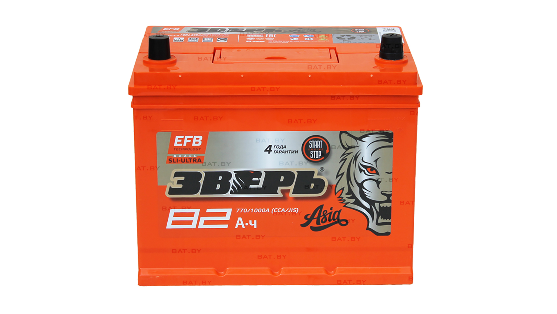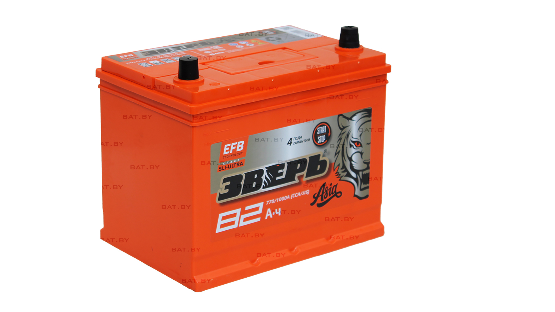 Автомобильный стартерный аккумулятор, предназначенная для запуска двигателей азиатских легковых автомобилей. Устанавливается на машины с большим объемом двигателя, внедорожники, кроссоверы. По габаритам такой же, как аккумуляторы на 70 Ач в азиатском корпусе. Акб полностью соответствует требованиям Японского Индустриального Стандарта (JIS), а также является призером многих независимых тестов. EFB аккумуляторы (EnhancedFloodedBattery – Улучшенная Батарея с жидким электролитом)– это улучшенная свинцовая АКБ, в которых применяется жидкий электролит. Аккумуляторы по технологии EFB имеют следующие особенности: устойчивость к глубоким разрядам, после которых EFB способны восстанавливать емкость практически до 100%, не теряя при этом часть ресурса; могут работать в широком диапазоне температур от -50 до +60 °C; улучшены показатели пускового тока; испарения жидкого электролита сведено практически к нулю; удвоение количества циклов заряда-разряда без потерь в функциональности. Разработанная совместно с Сибирским Отделением РАН запатентованная технология повышает надежность электродов и предотвращает осыпание активной массы. Это дает более чем 20% прироста тока холодной прокрутки и в зимнее время снижает воздействие низких температур. Высеченая технология при изготовлении электродов, обеспечивает низкий саморазряд и отсутствие "выкипания". У аккумулятора на 82 Ач морозостойкий ударопрочный корпус. Лабиринтная конструкция SMF крышки обеспечивает рекомбинацию паров электролита и предотвращает «выкипание», избавляя от необходимости добавлять воду на протяжении всего срока службы аккумуляторной батареи. Автоаккумулятор поставляется полностью заряженным, проверенным и готовым к эксплуатации.